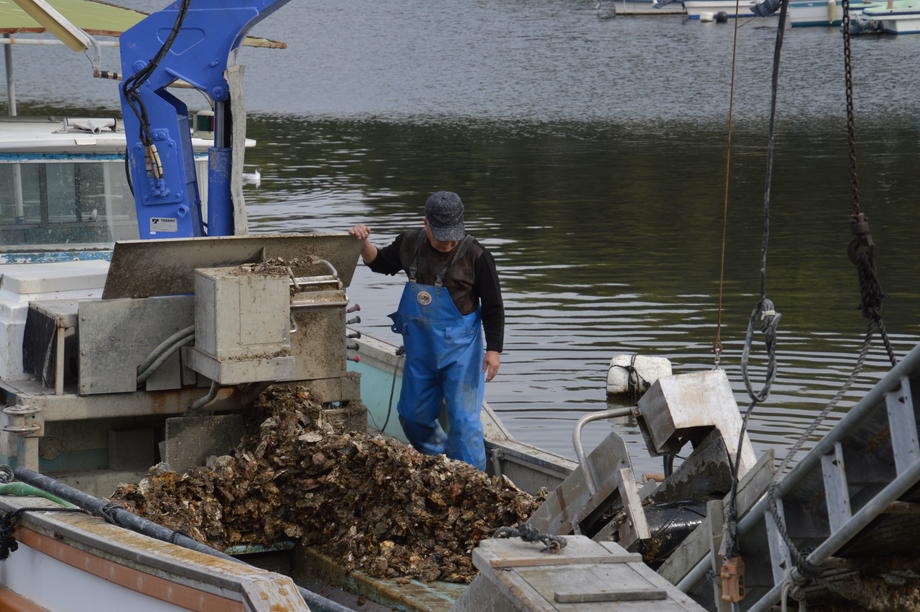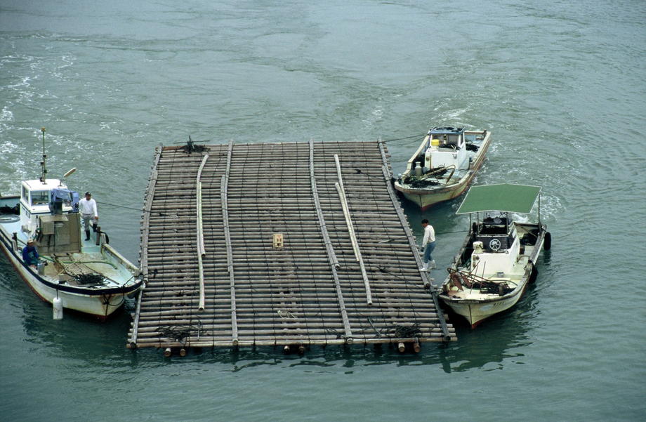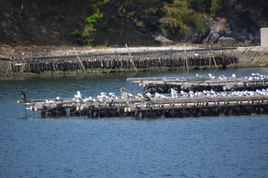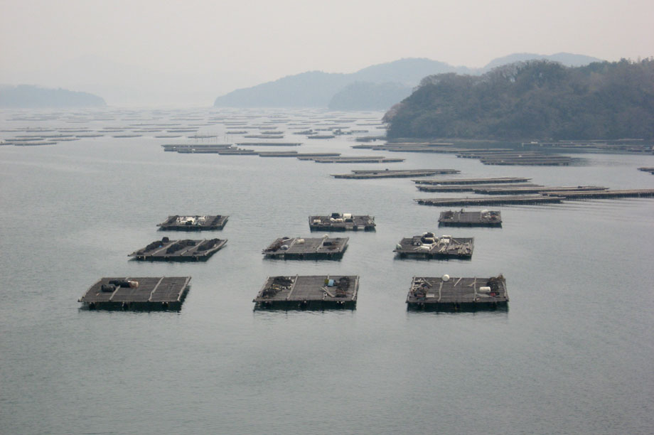 2.「牡蠣いかだ」。このいかだの下でたくさんの牡蠣が育っています。季節によっていかだの場所を変え、より栄養の多いところへと移動させます。