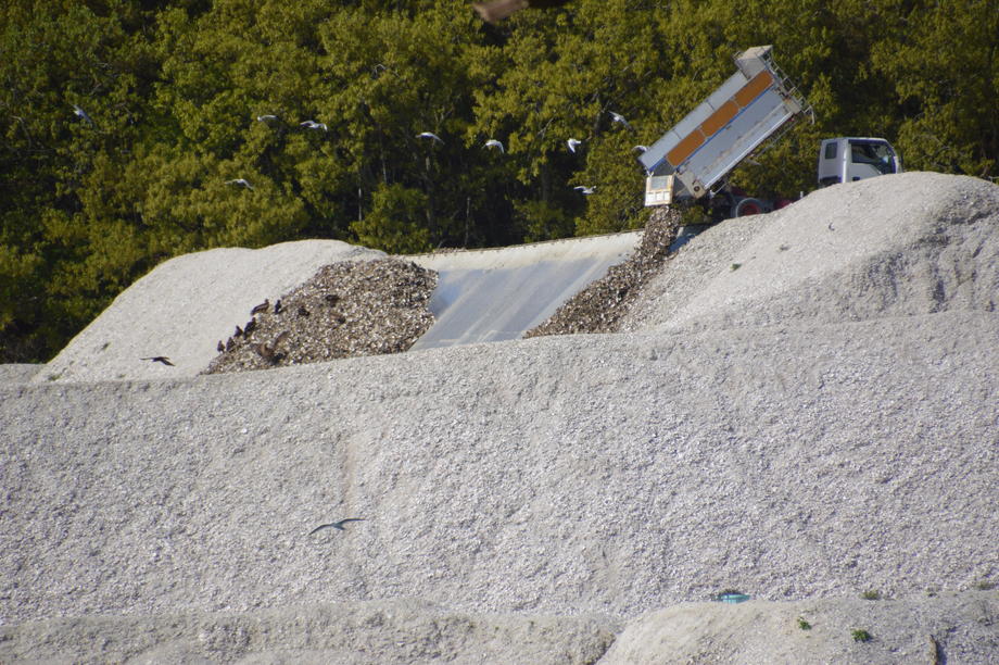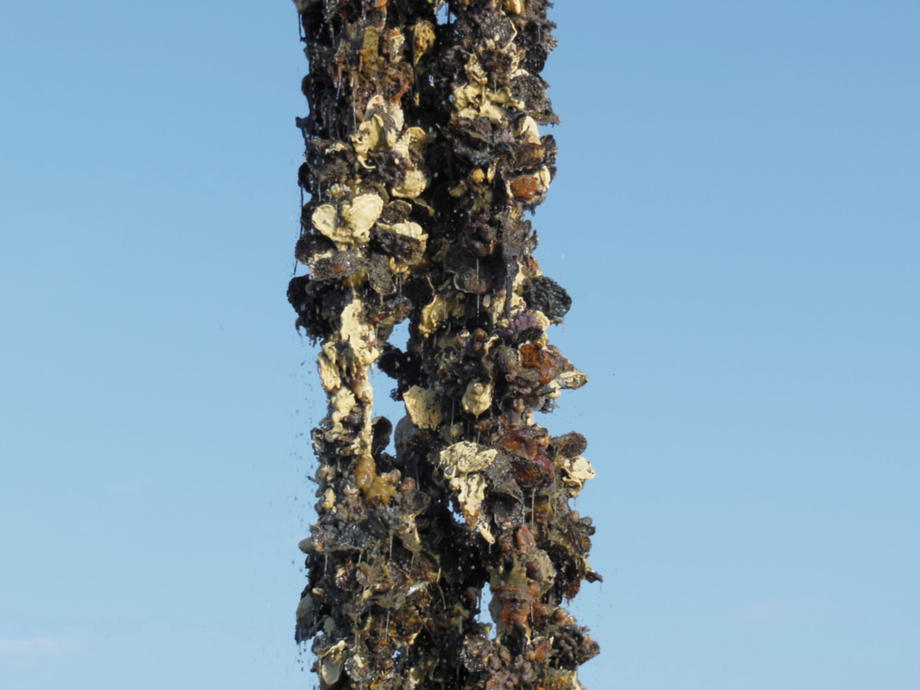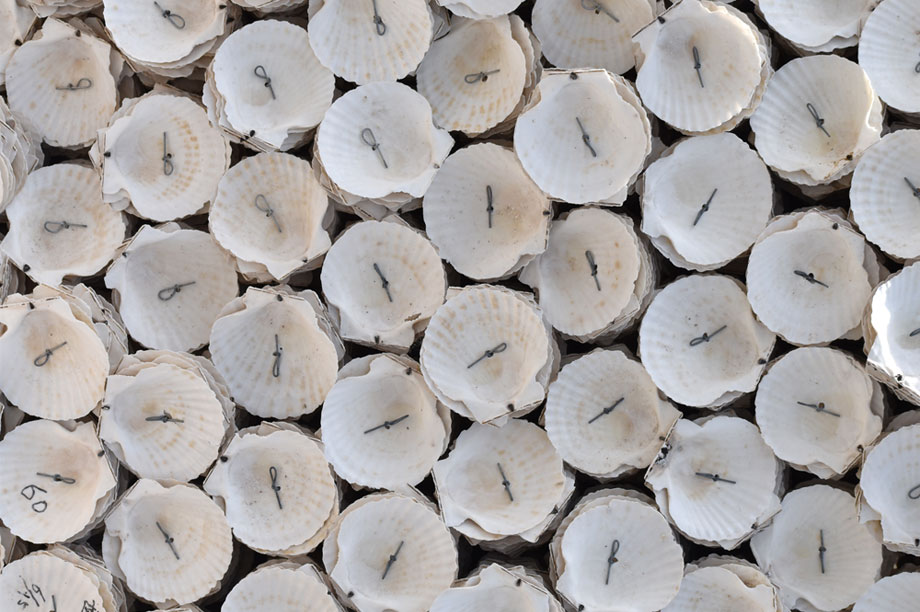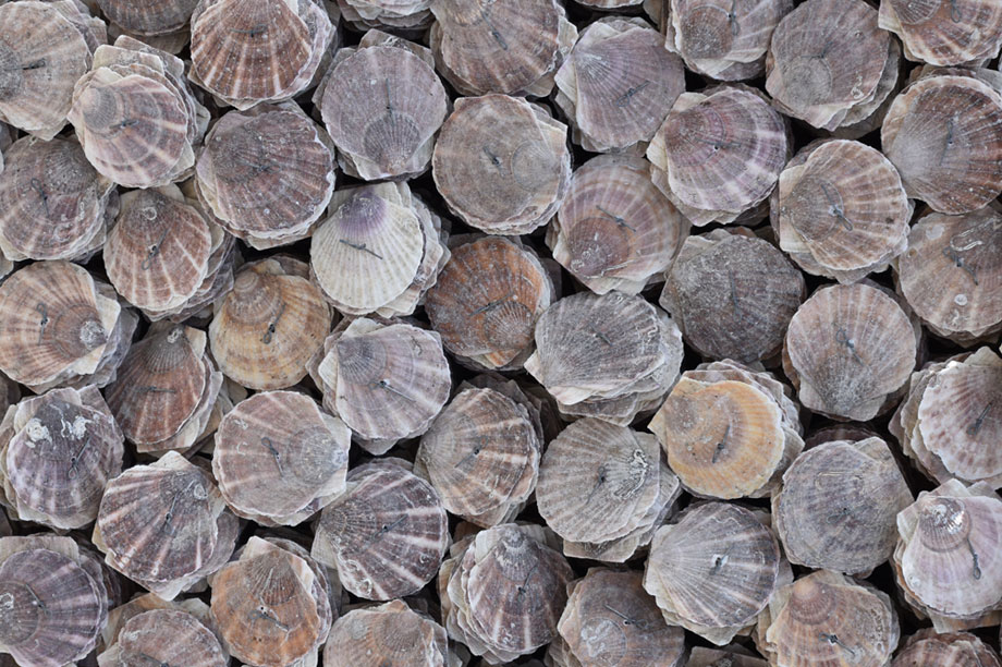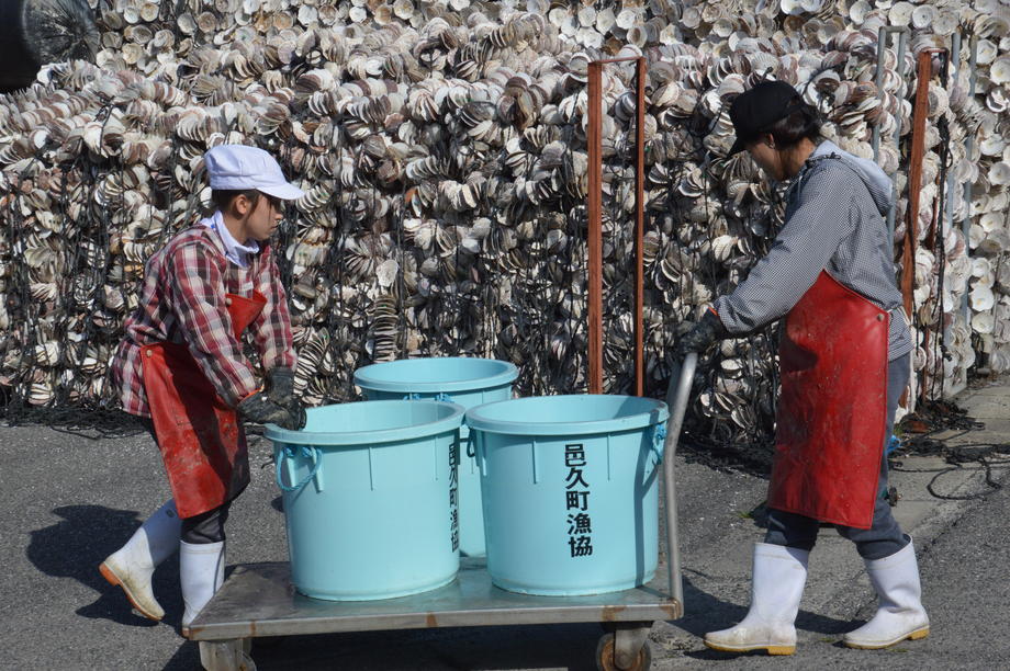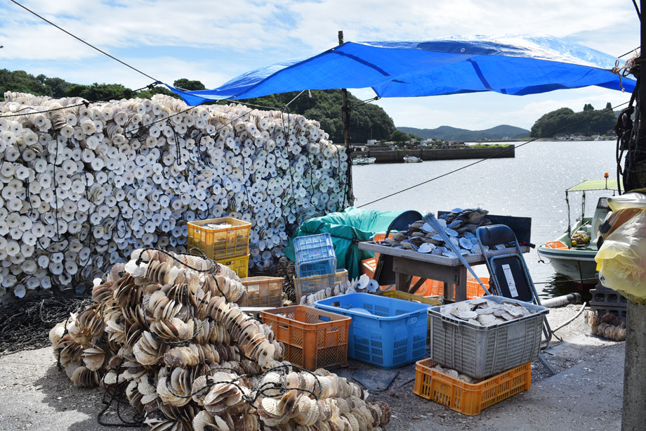 1.ホタテ殻に付いている小さな貝が「カキたね」と呼ばれる牡蠣の赤ちゃん。これを定着させて大きく育てていきます。